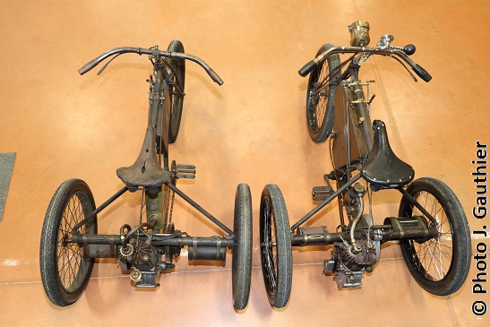 A droite : DEDION-BOUTON type Tricycle 1902 350cc.